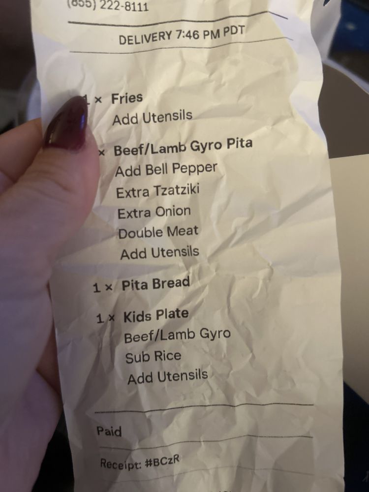 A ground seasoned beef patty served on a warm pita bread filled with fries, tomatoes, onions, and tzatziki sauce (or ketchup & mustard).